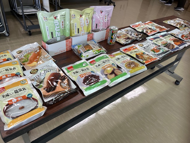 小休憩の際には、実際に非常食の試食が行われ鹿児島県栄養士会様でご購入いただいた最近ブレイク中の北海道ミルクデニッシュ(ロングライフパン)とアルファフーズUAA食(おかず)、カゴメ野菜一日これ1本が昼食です。