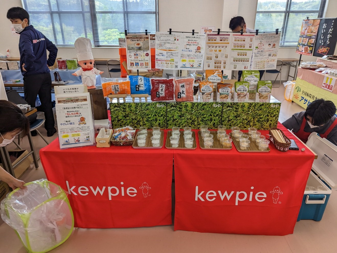 アサヒ物産はサンプルやパンフレットを配布、同時に「介護食試食体験」として、「ハウス やわらか倶楽部」と「フードケア エプリッチドリンク」の試食・試飲をしました。